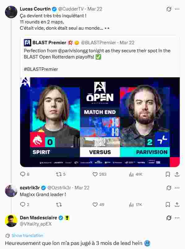 该评论发布于法国分析师Lucas Courtin的一条推特后面,该分析师在Spirit输给PARIVISION后评论:“情况已经非常、非常令人担忧了!两张地图只拿了11个回合。完全没战斗力,donk一个人孤立无援……”