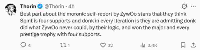 Spirit在任何时期的阵容都是‘donk加四个辅助’。这件事最好笑的地方在于,按照他们自己的逻辑,他们等于承认了donk做到了ZywOo从未做到的事:带着四个辅助赢得了Major和所有顶级赛事的冠军。”