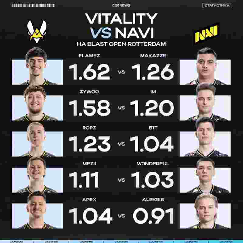 Natus Vincere,这预示着Vitality在本次赛事的状态处于绝对上风。特别是flameZ和ZywOo分别以1.62、1.58的平均rating断层领先位列第一第二。特别是Vitality曾经的首席科学家flameZ,在本次赛事的发挥甚至超越了队内大哥ZywOo,ropz更是直言现在的flameZ比donk更强。如果能在决赛中稳定发挥,很有可能会打破ZywOo“30岁前包揽全队MVP”的誓言。