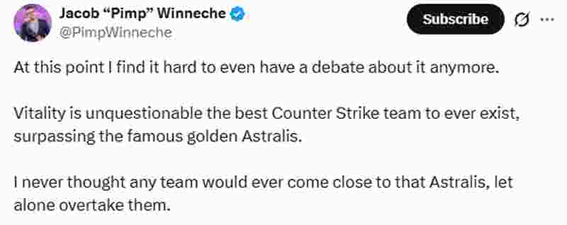“如今我觉得,这事甚至都没什么好争论的了。Vitality毫无疑问是史上最伟大的CS战队,超越了传奇的黄金Astralis。我从未想过有队伍能接近那支Astralis,更不用说超越他们了。”