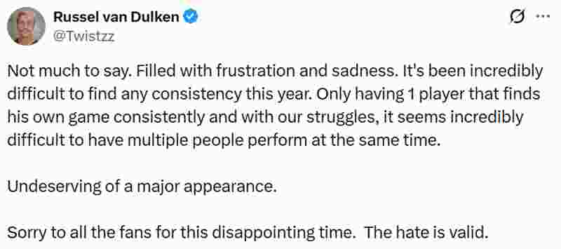 Twistzz:“没什么可说的,心里满是沮丧和难过。今年一直很难找到任何稳定性。只有一名选手能保持自己的状态,再加上我们整体的挣扎,想要让多人同时发挥似乎难如登天。