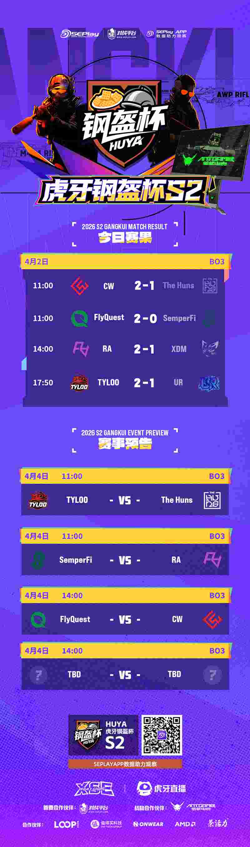 钢盔杯 S2第三日将于4月4日11:00正式开始,TYLOO迎战The Huns,RA则是迎来澳洲队SemperFi挑战,这两场比赛都是生死战,胜者将会在当日14:00进行败者组半决赛的比拼。