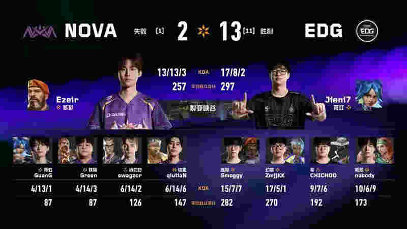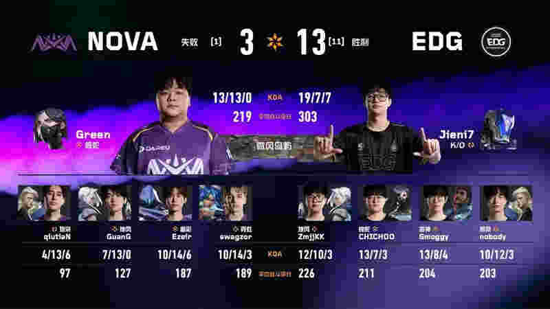 下半场手枪局由EDG拿下,率先拿到赛点。NOVA虽惊险追回一分,但分差过大且毫无容错空间。最终
