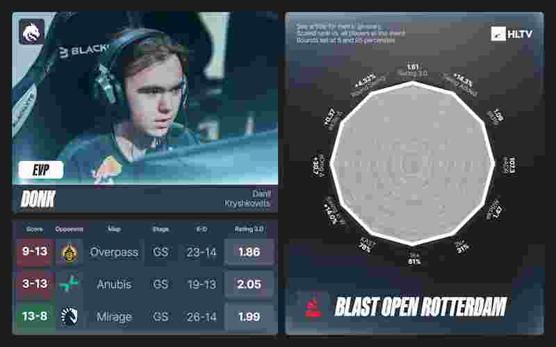 小组赛EVP本就罕见,但donk从不被常人能达到的标准所束缚。继去年BLAST伦敦站以1.59 rating获得小组赛EVP后,他本次以1.61 rating刷新了自己保持的CS2历史最高rating EVP纪录(数据由论坛用户asyl1m统计)。