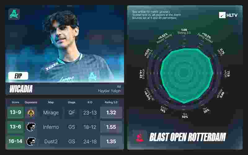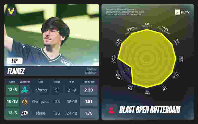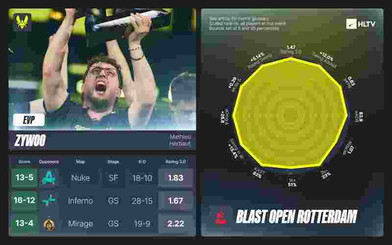 ZywOo在鹿特丹打出1.47 rating,延续了2026年的火热开局。这位四届年度最佳选手正向更高的目标发起冲击,而Vitality的统治仍在继续。他在整个赛事中展现出了无与伦比的稳定性:所有地图rating均高于1.00,并以全场最高的+5.14%回合加权贡献值领跑。