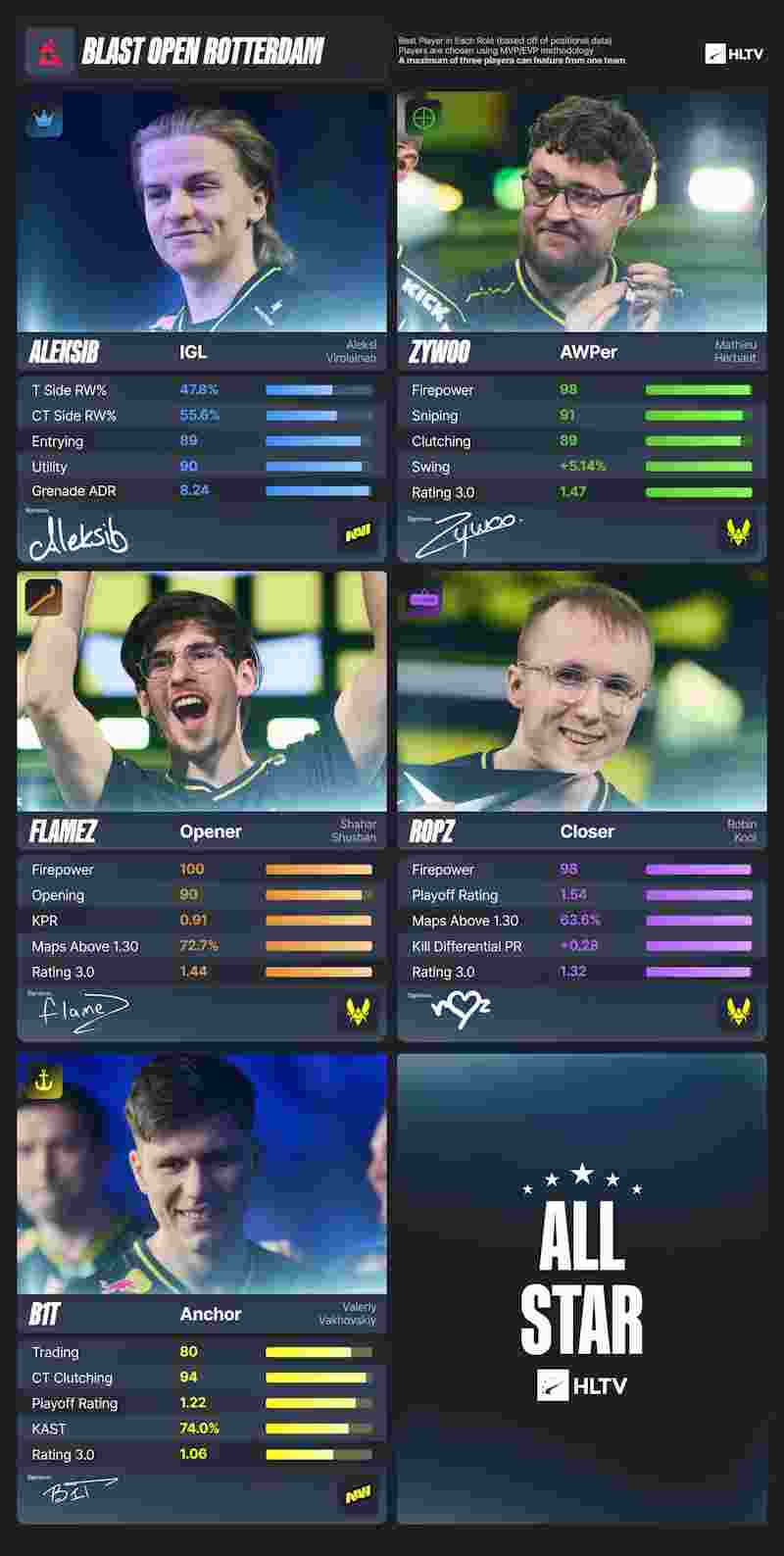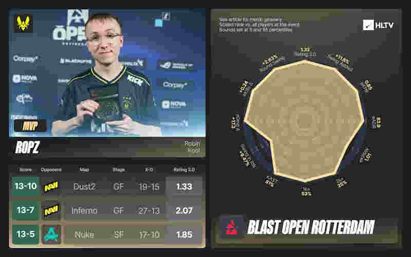Vitality的统治力不言而喻——他们阵中有三名选手都具备角逐BLAST鹿特丹MVP的实力。最终,ropz凭借淘汰赛阶段的统治级表现锁定这一殊荣,尽管小组赛阶段稍显慢热。但无论他、ZywOo还是flameZ,都将凭借此次赛事中的集体火力盛宴,在年终Top20评选中获得同等的分量。