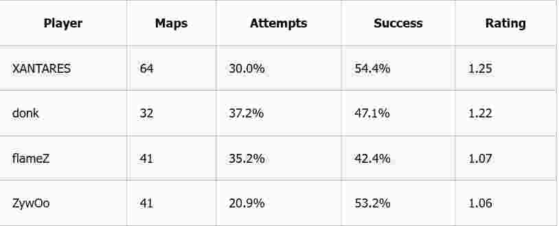 这一切很大程度上要归功于flameZ。数据博主statsmeister近期在X平台发文称,flameZ是今年大型赛事中补枪击杀数第二多的选手。一名选手补枪数高,需要满足两个条件:一是自身频繁前顶阵亡,二是队友能及时跟上完成补枪。相较于XANTARES和donk,flameZ的突破频率要高得多。这不仅直接为Vitality带来战绩优势,还彻底激活了ZywOo—— 后者在补枪击杀榜单上同样位列第三。