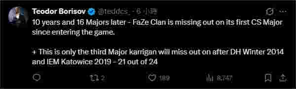 十年过去,参与了16届Major之后——FaZe自进入CS以来,第一次无缘Major。另外,这也是karrigan职业生涯中第三次缺席Major,此前两次分别是2014年DreamHack冬季Major和2019年IEM卡托维兹Major——24届中打了21届。