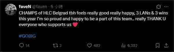 HLC冠军。说实话,这种感觉特别棒,我也特别开心。今年三项线下赛,三个冠军。我真的非常自豪,也很庆幸能成为这支队伍的一员……真心感谢每一个支持我们的人。