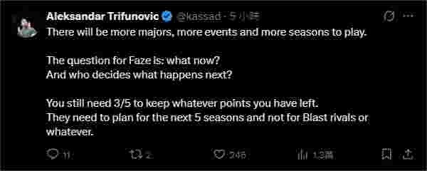 还会有更多的Major、更多的赛事,以及更多的赛季要去打。对FaZe来说,问题在于接下来怎么办?又该由谁来决定下一步会发生什么?如果还想保住他们现有的积分,阵容里至少得保留3/5的核心。他们现在需要考虑的,不该只是BLAST对抗赛之类的短期赛事,而是未来接下来五个赛季的整体规划。