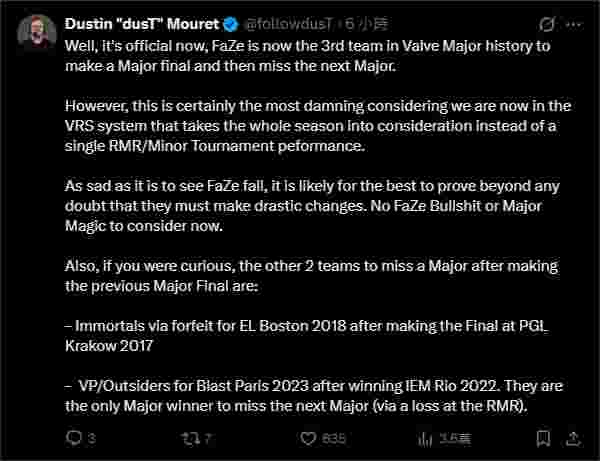 现在已经正式确认,FaZe成为了Valve Major历史上第三支打进前一届Major决赛,却无缘下一届Major的队伍。不过这次的意义显然更加严肃,因为现在已经是VRS体系了。这个体系考量的是整个赛季的表现,而不再只是单一一届RMR或Minor的发挥。