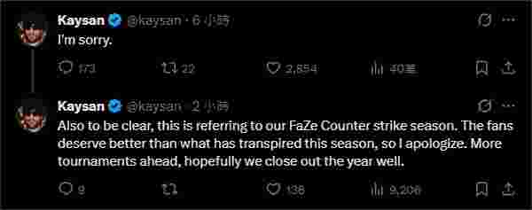 我直到现在都不敢相信这件事。向所有FaZe粉丝道歉。我找不到词来形容自己现在的感受。你们绝对值得更好的成绩。