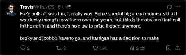 FaZe那套“粘合不拆”的建队哲学以前确实很有意思,真的。过去这些年里,我也很幸运,亲眼见证过他们在很多大型场馆里打出的那些特别时刻。可现在这显然就是棺材上的最后一颗钉子了,而且已经没有什么工具能再把它撬开。broky和jcobbb必须离开,karrigan也该做出决定了。