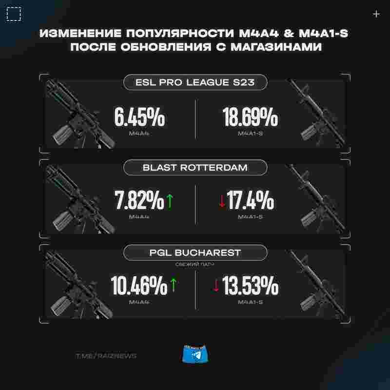 近日外媒raiznews通过统计近三届大赛枪械使用频率发现,M4A4从EPL S23开始的6.45%,逐渐增长到了当前PGL布加勒斯特的10.46%,而M4A1的使用率从EPL的19.69%降低到了当前的13.53%。
