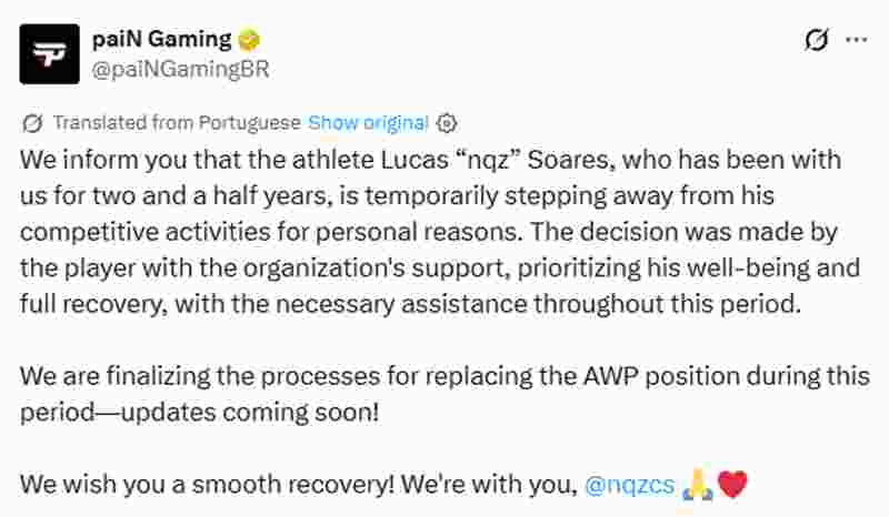 paiN宣布nqz因个人原因暂离赛场,且未给出这位狙击手的回归时间表。根据外媒报道,在可预见的未来,巴西狙击手nqz将被saffee替换。