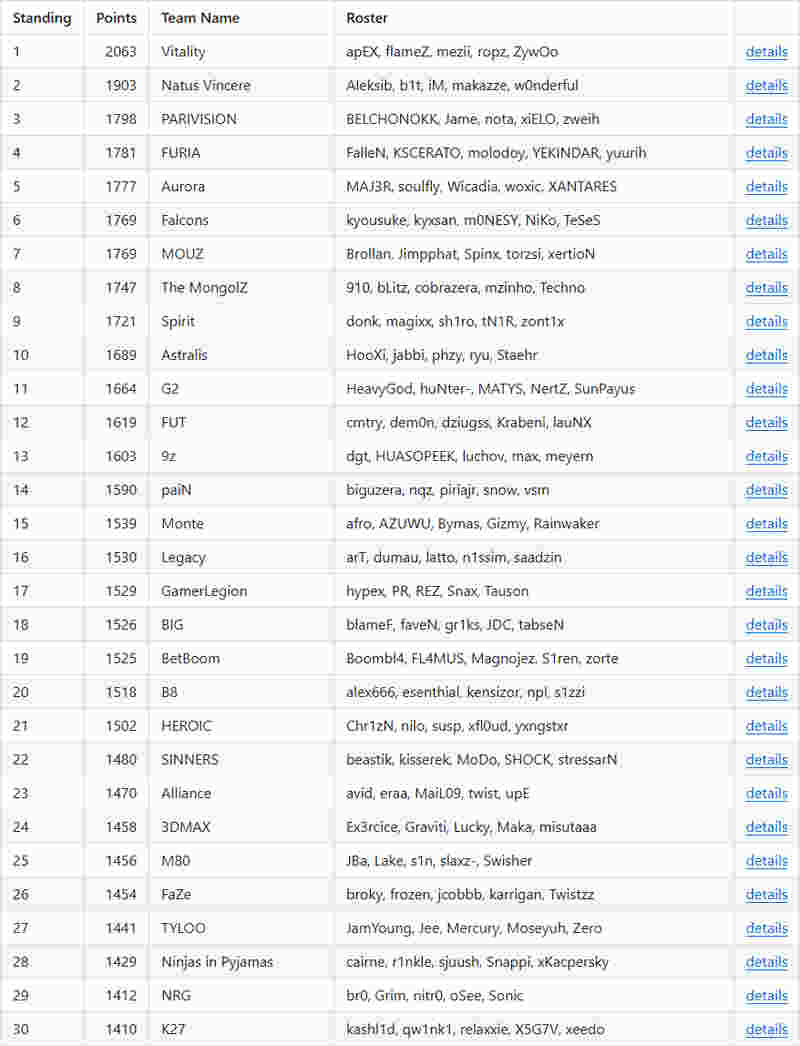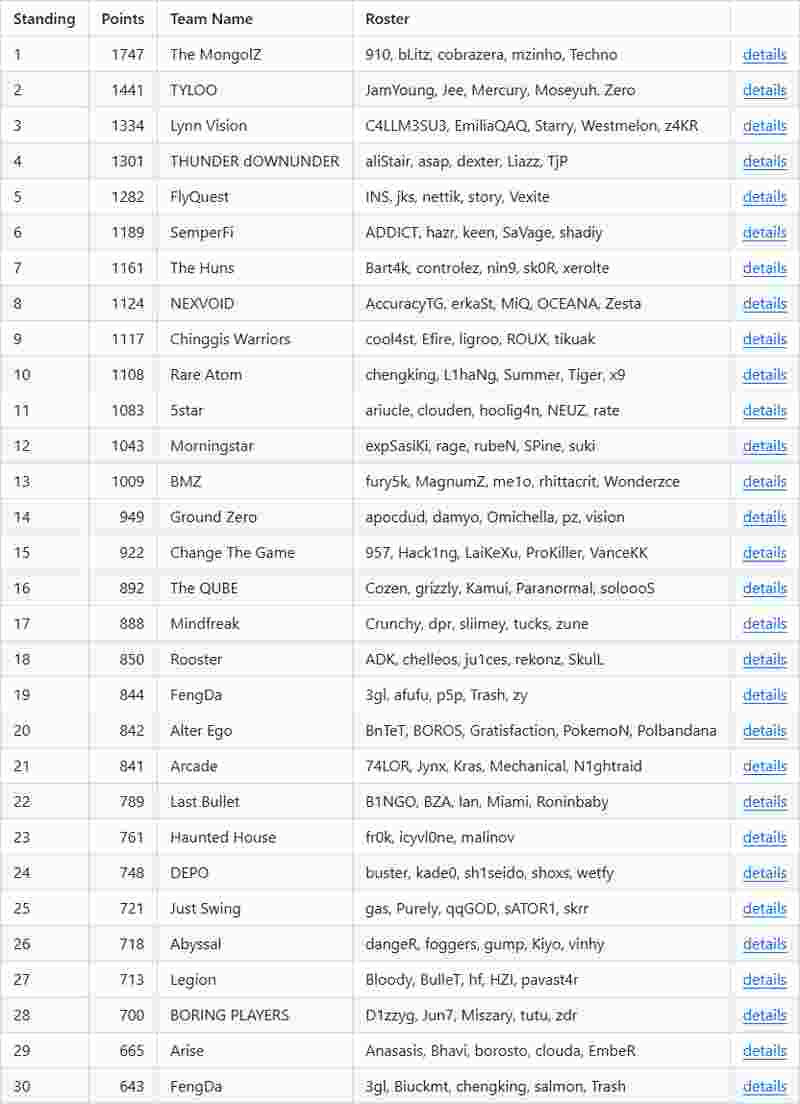 以下是截至4月6日官方排名中前30名队伍的情况: