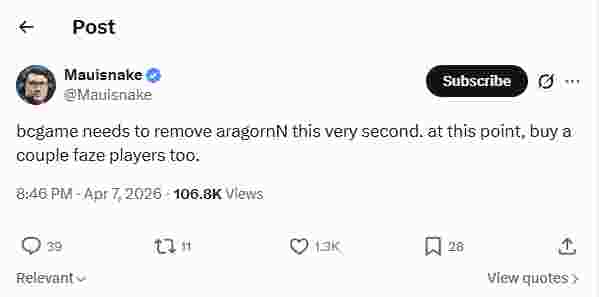 “BC.Game必须立刻把aragornN踢了。现在这种情况,也该买几个FaZe的选手补强了。”