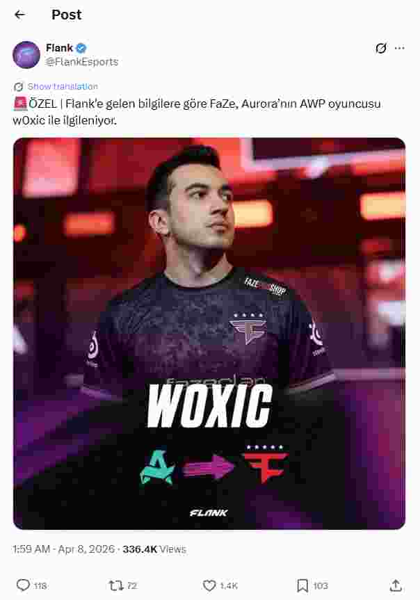 Aurora的土耳其狙击手woxic补强CS2阵容。
