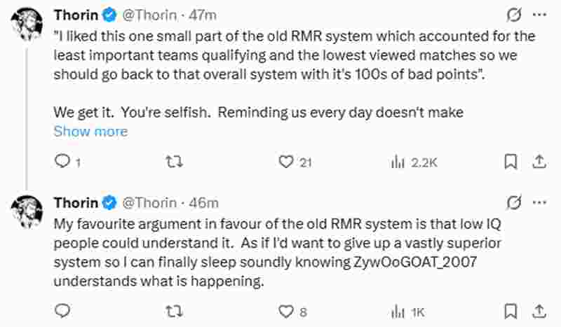 我最爱听的那种支持老RMR体系的说法就是:智商低的人也能看懂。说得好像我宁愿放弃一个强得多的新体系,就为了让ZywOoGOAT_2007(ZywOo粉丝)那哥们儿能睡个安稳觉、搞明白比赛怎么回事似的。”