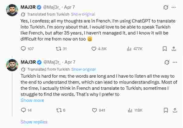 “我承认我所有的想法(前几日MAJ3R在X上发的一些人生感慨)都是用法语的,我用ChatGPT把它们翻译成土耳其语,对此我感到抱歉。我多么希望能像说法语一样说土耳其语,但在35年之后我没能实现,而且我知道以后对我来说也会很难。