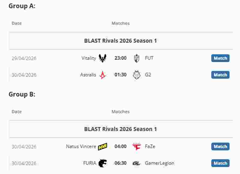 BLAST公布了即将于4 月27日在德克萨斯州沃斯堡举行的BLAST对抗赛2026 S1的小组赛分组及揭幕战对阵。