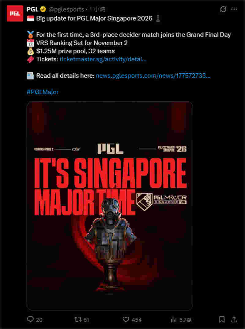 PGL新加坡Major 2026将于11月24日至12月13日举行,32支队伍将争夺125万美元总奖金。赛事最后四天将在新加坡室内体育馆线下举行,粉丝们将在此见证决定冠军归属的关键对决。
