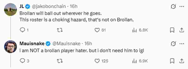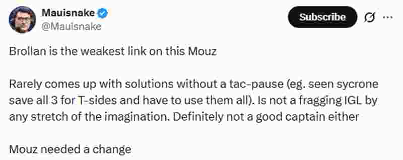 “Brollan是这支MOUZ中最薄弱的一环。没有战术暂停的情况下,他几乎想不出什么解决办法(比如sycrone为T方攒了三个暂停,结果全用上了)。他完全算不上是那种能靠枪法带队的指挥。当然也不是一个好的队长。MOUZ需要做出改变。”