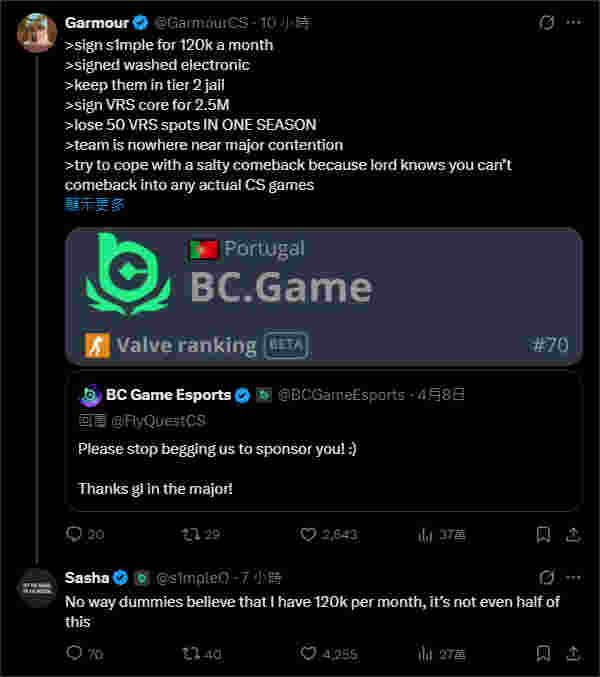 BC.Game薪水的传闻。此前博主Garmour声称:“(考虑到s1mple的表现),他每月拿12万美元是白费钱。”