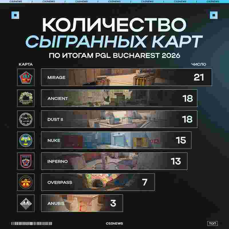 Mirage凭借21次出场数位列第一,Ancient和Dust2各出场18次并列第二。排第四的Nuke以两场数量领先Inferno,Overpass和Anubis依旧是选取数最少的地图。
