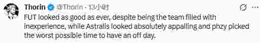“FUT一如既往地发挥稳定,尽管队里全是新人;而Astralis打得简直惨不忍睹,phzy偏偏在最要命的时候状态全无。”