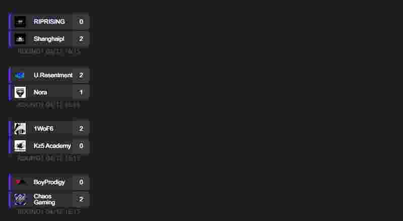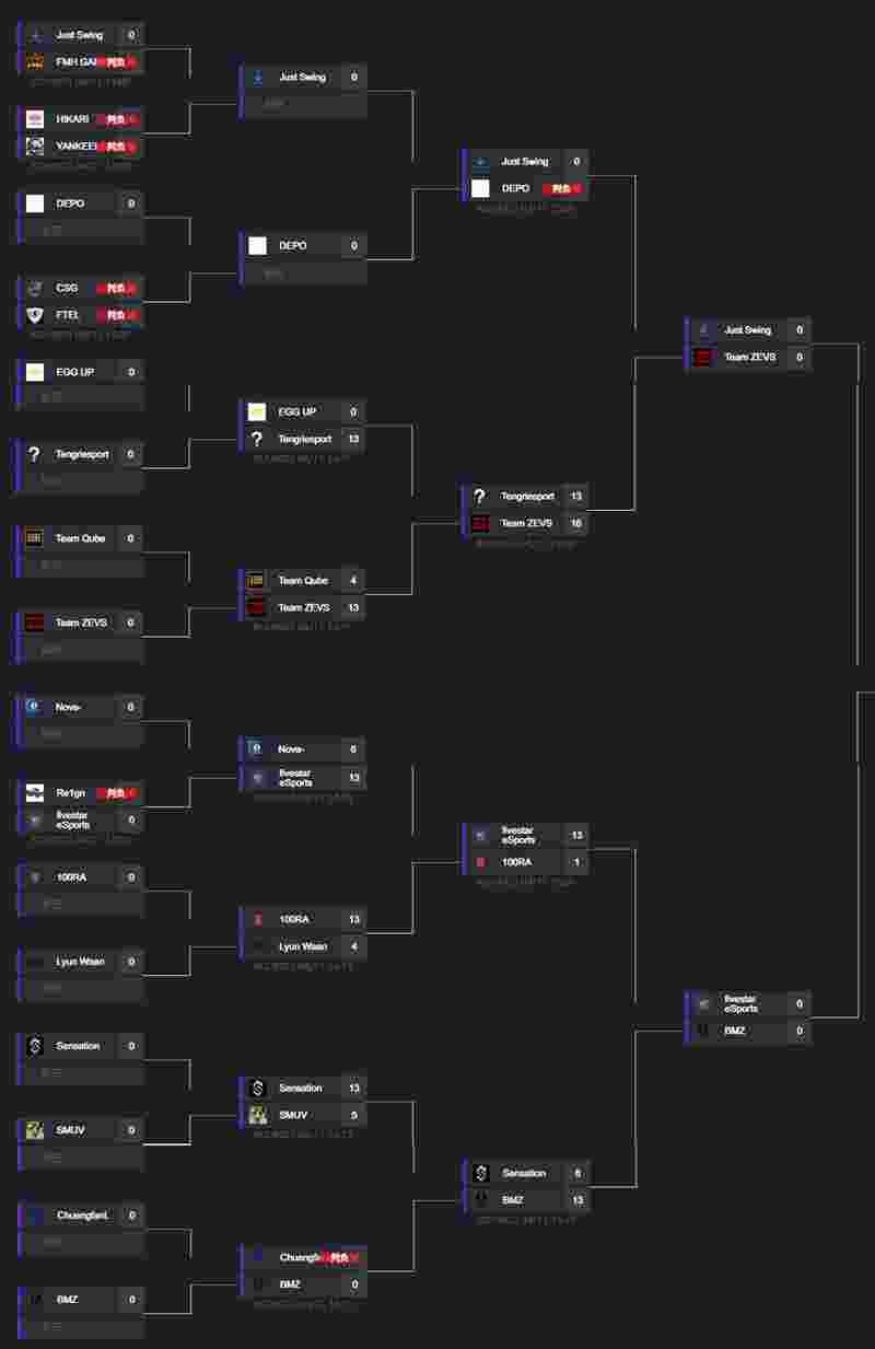 ZEVS在和对手战至加时后也险胜晋级。而下半区的fivestar eSports全程碾压100RA,BMZ也不出意外战胜
