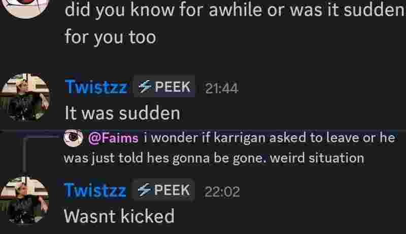今日,Twistzz在Discord服务器上与粉丝交流时,确定了karrigan离开