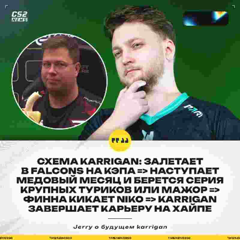 Jerry:“karrigan的剧本:空降Falcons当队长→进入蜜月期并开始拿下大型赛事或Major冠军→最终把NiKo踢掉→karrigan在热度巅峰退役。”