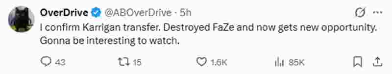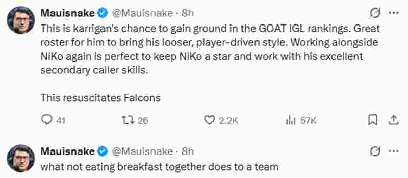 这是karrigan在‘史上最佳指挥’排名中取得优势的好机会。这套阵容非常适合他发挥那种更自由、以选手驱动的风格。再次与NiKo并肩作战非常理想,既能保持NiKo的明星地位,又能发挥他出色的副指挥能力。这将重振Falcons。”