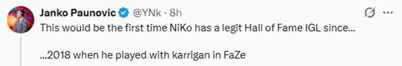 YNk:“这将是NiKo第一次拥有一位真正意义上的名人堂级别的指挥,自……2018年在FaZe与karrigan一起打比赛以来。”