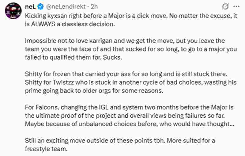 neL:“在Major之前踢掉kyxsan是一个非常混蛋的举动。不管什么借口,这永远都是一个没有风度的决定。不可能不喜欢karrigan,我们也理解这次转会,但你离开了那支你曾是门面担当、且沉沦了那么久的队伍,然后去参加一个你没能带他们打进的正赛。真让人难受。