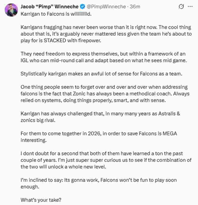 “karrigan去Falcons这事儿太疯狂了。karrigan的个人枪法状态从未像现在这样差。但有意思的是,考虑到他即将加盟的队伍火力爆棚,他的枪法可以说比以往任何时候都更不重要。