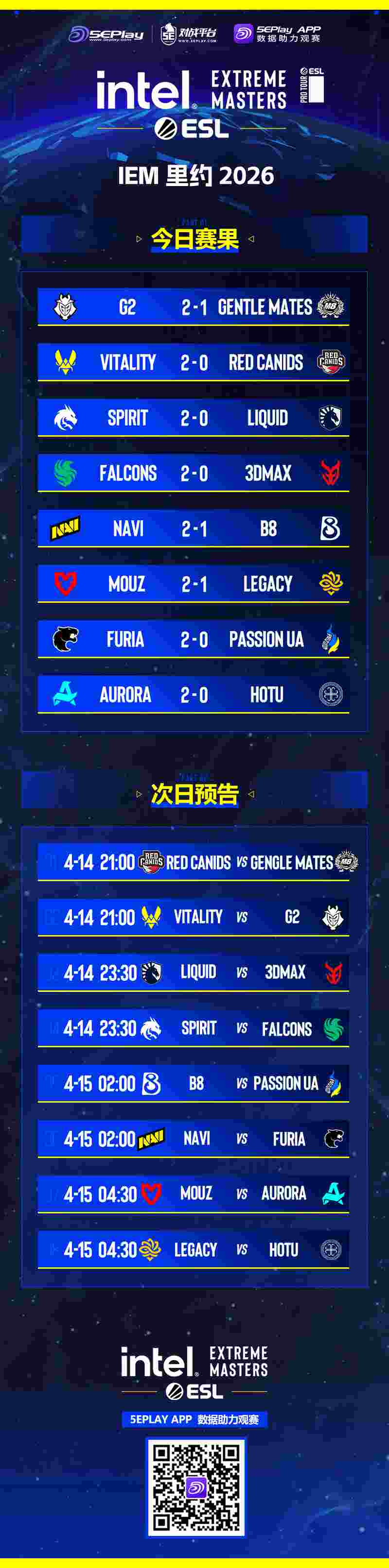 在第二日的比赛中,死亡之组A组胜者组将迎来非常激烈的对决,Vitality迎战G2、Spirit则是遇到了Falcons;而在B组胜者组中MOUZ碰上了Aurora,而NAVI则是对阵东道主FURIA。