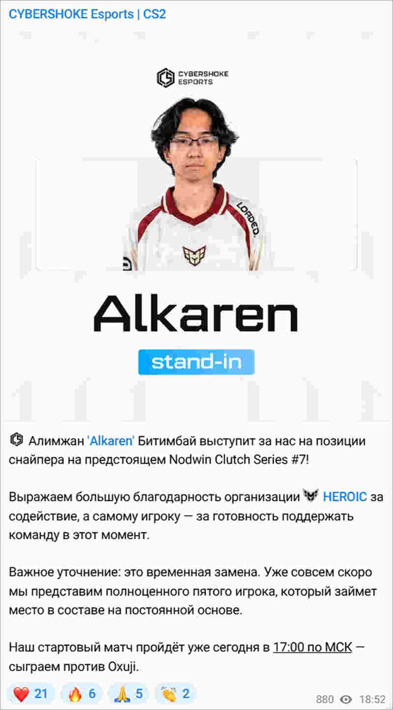 “Alkaren将在即将到来的NODWIN Clutch 系列 7 赛事中担任我们的狙击手!衷心感谢HEROIC俱乐部的协助,也感谢选手本人在此刻愿意支持我们。需要说明的是,这只是临时替补。我们很快将公布正式第五人,长期占据阵容席位。”