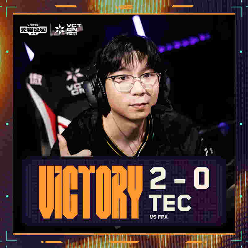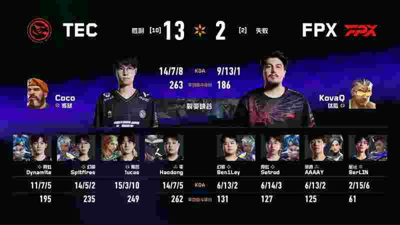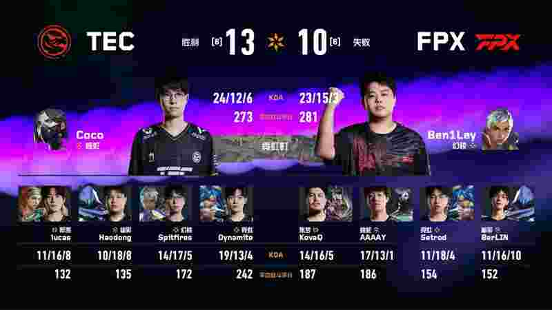 Ding Dajian (丁达建) | Coco统治蝰蝮,拿下四杀击溃对手。第十八回合,TEC逐渐起势拉开分差,Coco在极限时间进点斩获三杀。第十九回合,Ben1Ley继续发挥,化身“广告牌战神”,以铁血防守再取三杀。第二十回合,Dynamite开启大招杀进包点,如蓝色闪电撕裂敌阵,狂砍五杀。最终TEC以13-10拿下图二,总比分2-0战胜FPX。