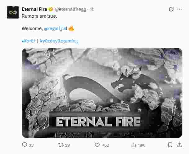 Eternal Fire在俱乐部官方X账号正式宣布签下regali。这位罗马尼亚籍狙击手在离开FlyQuest后重返赛场。