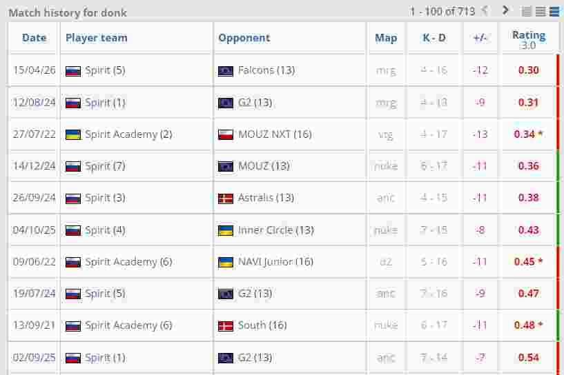 Falcons的图二Mirage中,donk打出了个人职业生涯单图最差Rating,他仅拿到0.30 Rating,单图K/D为4/16。