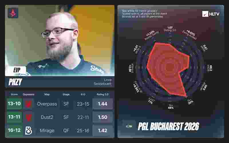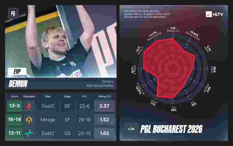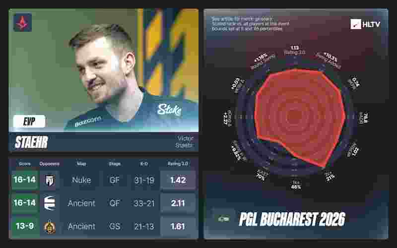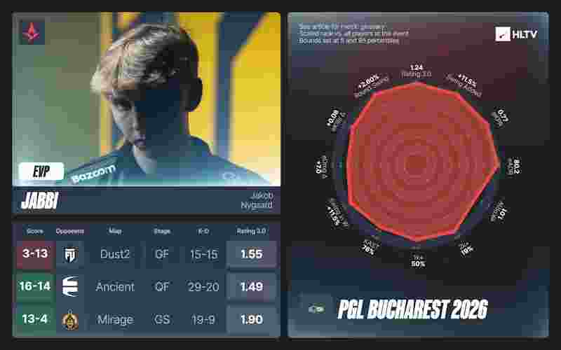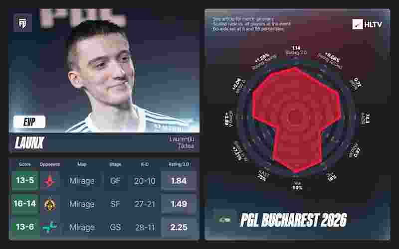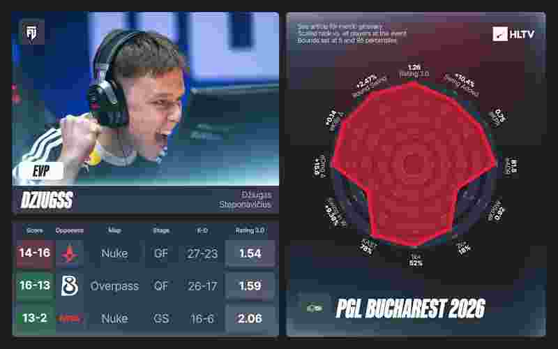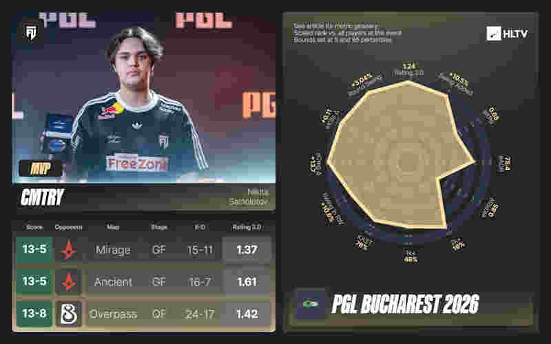 2026年的MVP争夺战接连不断,且竞争激烈。PGL布加勒斯特2026,cmtry凭借在获胜地图以及总决赛中的整体表现,力压dziugss,摘得MVP奖牌。