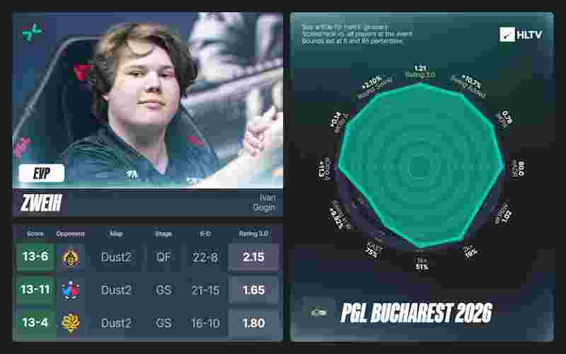 尽管PARIVISION止步四分之一决赛,zweih仍收获了作为PARIVISION选手的第二个EVP——他在队伍其他步枪手状态低迷时挺身而出。他1.21的赛事rating伴随着1.01的每获胜回合击杀,并且在50%的比赛中位列队内击杀前三。在小组赛阶段表现出色之后,他在淘汰赛对阵The MongolZ时打出了2.15的rating峰值(决胜图上半场同样出色),从而锁定了自己的EVP。