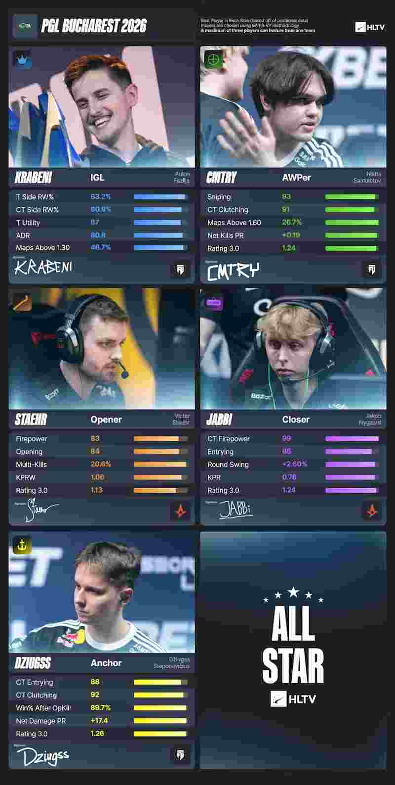 Astralis仅为42.1%。这为Staehr留出了空间,他作为队伍的突破手取代了lauNX,使得两支决赛队伍在全明星阵容中形成3-2的分配。