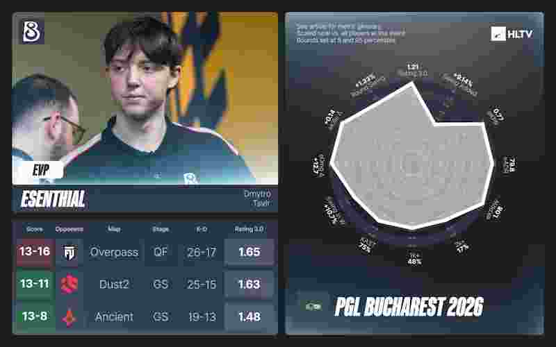 esenthial在布加勒斯特打出了自己职业生涯最佳的线下赛表现,首次跨过1.20 rating的门槛。为了彰显他在2026年的进步,尽管他仍担任辅助步枪手角色,但今年在线下赛的rating已达1.13。他在淘汰赛阶段的每获胜回合击杀(1.07 KPRW)位列所有选手第二,并且在B8的获胜地图中平均rating为1.39(计入四分之一决赛被淘汰的地图后为1.37)。esenthial在除两张地图外的所有比赛中rating均高于1.00,在他出战的14场比赛中36%位列队内击杀榜首,他的表现足以让他获得本届赛事的第八个也是最后一个EVP。