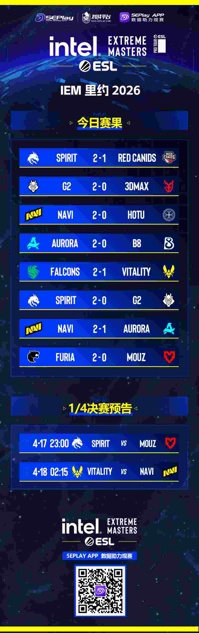 在淘汰赛1/4决赛中,Spirit迎战MOUZ,胜者将对阵Falcons;而Vitality则是要对阵NAVI,胜者则会迎战东道主FURIA。