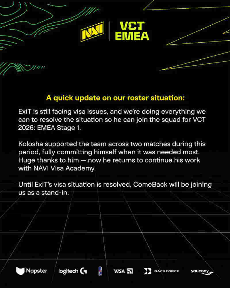 NAVI在一份声明中表示:“ExiT仍在处理签证问题,我们正在尽一切努力解决这一情况,使他能够尽快归队参加2026 VCT EMEA第一赛段。Kolosha在此期间为队伍提供了两场比赛的支持,在最需要他的时候全力以赴。非常感谢他——现在他将回到NAVI继续工作。”