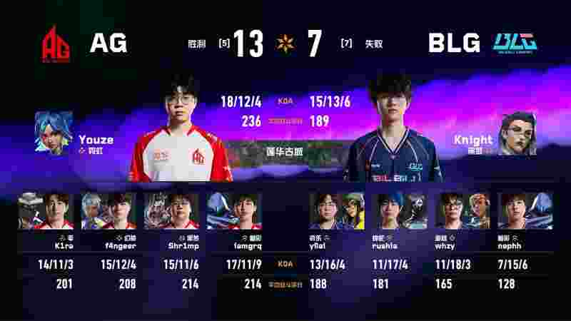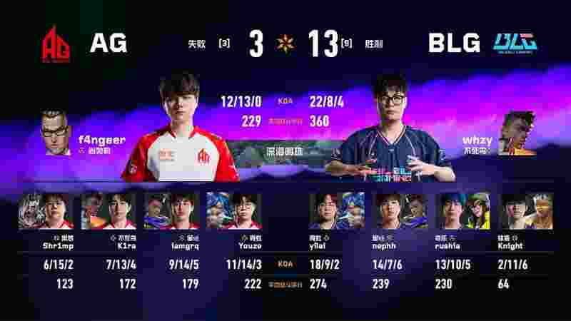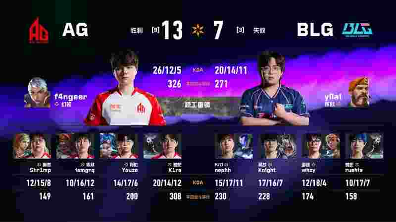 Liu Yuxiang (刘宇翔) | Knight与iamgrq互砍关键三杀。下半场BLG一分未得,AG连拿8分,将比分锁定在13-7,AG先下一城。
