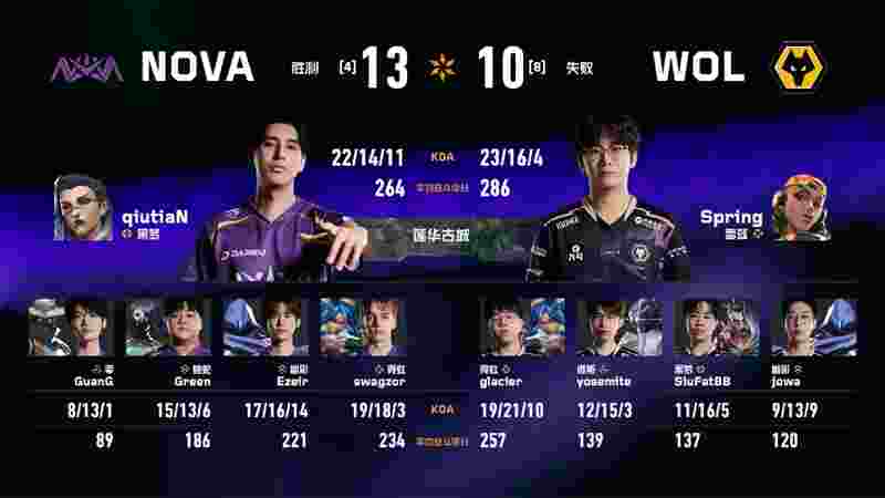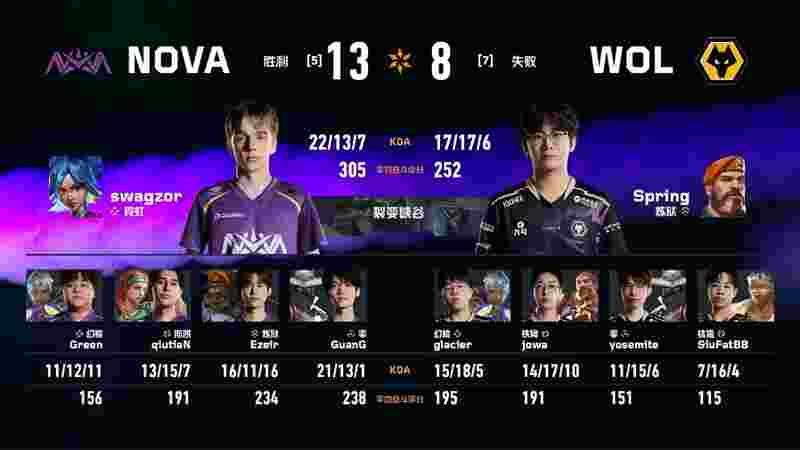 下半场手枪局由NOVA拿下。第十四回合,WOL强起完成ECO翻盘。第十五回合,Ezeir三杀,NOVA追回一分。第十六回合,GuanG赢下残局,NOVA将比分追平。第十九回合,Green赢下残局,分差扩大至三分。第二十回合,NOVA多人发挥拿下比分,率先进入赛点。最后一回合,swagzor三杀终结比赛。NOVA以13-8赢下图二,总比分2-0战胜WOL,收获本赛段首胜。